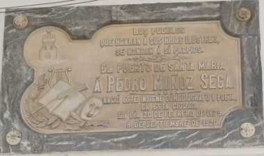 Pedro Muñoz Seca fue un reconocido dramaturgo nacido en El Puerto de Santa María el 21 de febrero de 1879 en la calle Zarza. En reconocimiento a su trayectoria, el Ayuntamiento colocó en 1920 una placa conmemorativa, por suscripción popular, en la casa donde nació, calle Nevería, posteriormente conocida como calle Pedro Muñoz Seca. En la inscripción destaca el profundo afecto de la ciudad por su hijo predilecto. Durante la ceremonia, Muñoz Seca pronunció un emotivo discurso en el que expresó su gratitud y destacó su devoción por la Virgen de los Milagros, patrona de la ciudad.