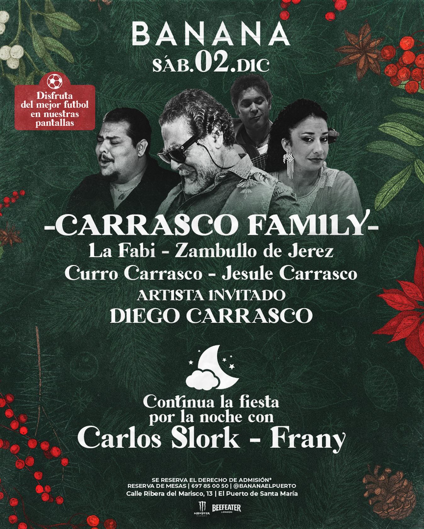 - Zambomba - Lugar: Ribera del Marisco, 13 - Hora: 17:00 h.- Con la actuación de "CARRASCO FAMILY": Artista invitado DIEGO CARRASCO y La Fabi - Curro Carrasco - Zambullo de Jerez - Jesule Carrasco - Entrada gratuita