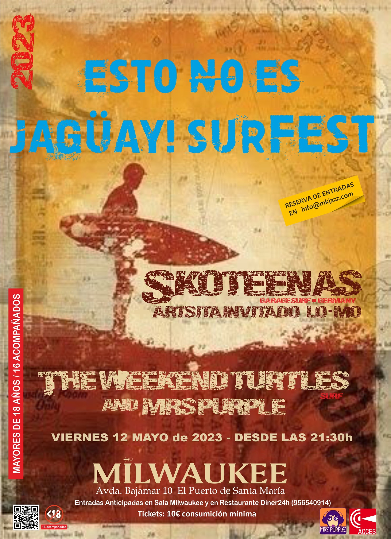 Actuarán tres bandas que dedican su repertorio a la música surf-garaje-surf: SKOTEENAS, LO-MO, The Weekend Turtles. También contaremos con la DJ Mrs. Purple.